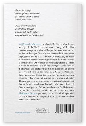 À 80 km de Monterey, on aborde la côte la plus sauvage de la Californie : Big Sur, où a vécu Henry Miller. Une destination qui est moins un lieu que l'état d'esprit contemplatif avec lequel le poète saisit la beauté du voyage auquel il nous convie, en 44 poèmes qui sont autant d'étapes inattendues : on y croise un violoniste tsigane à l'Hôtel Astoria de Budapest; des bisons sauvages dans la forêt de Bialowieza; une professeur de fitness à Boston; des faussaires à Los Angeles; une boulangère juive millionnaire à Prague; ou encore un révérend concupiscent à Glasgow. Chaque poème a ici fonction de « certificat d'existence », à la manière des calendriers d'hiver des Indiens des Plaines où étaient consignés les événements d'une année. Guillaume Decourt, né en 1985, a publié dix ouvrages et collabore à de nombreuses revues. Ses poèmes ont été traduits en une dizaine de langues. Il donne des lectures dans des festivals en France et à l'étranger. Il partage son temps entre Paris et Athènes.