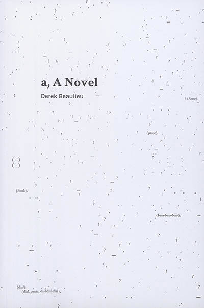 Derek Beaulieu's a, A Novel is an erasure-based translative response to Andy Warhol's eponymous novel. Beaulieu carefully erase all of the text on each page of the original work, leaving only the punctuation marks, typists' insertions and onomatopoeic words. The resultant text is a novelistic ballet mécanique, a visual orchestration of the traffic signals and street noises. This visually powerful half score/half novel highlights the musicality of non-narrative sounds embedded within conversation.