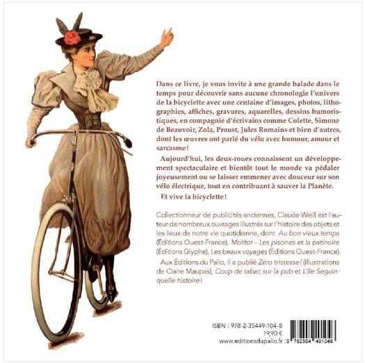 Dans ce livre, je vous invite à une grande balade dans le temps pour découvrir sans aucune chronologie l'univers de la bicyclette avec une centaine d'images, photos, lithographies, affiches, gravures, aquarelles, dessins humoristiques, en compagnie d'écrivains comme Colette, Simone de Beauvoir, Zola, Proust, Jules Romains et bien d'autres, dont les Åuvres ont parlé du vélo avec humour, amour et sarcasme ! Aujourd'hui, les deux-roues connaissent un développement spectaculaire et bientôt tout le monde va pédaler joyeusement ou se laisser emmener avec douceur sur son vélo électrique, tout en contribuant à sauver la Planète. Et vive la bicyclette ! Collectionneur de publicités anciennes, Claude Weill est l'auteur de nombreux ouvrages illustrés sur l'histoire des objets et les lieux de notre vie quotidienne, dont Au bon vieux temps et Les beaux voyages (Éditions Ouest-France), Molitor - Les piscines et la patinoire (Éditions Glyphe), , L'île Seguin : quelle histoire ! (Éditions du Palio).