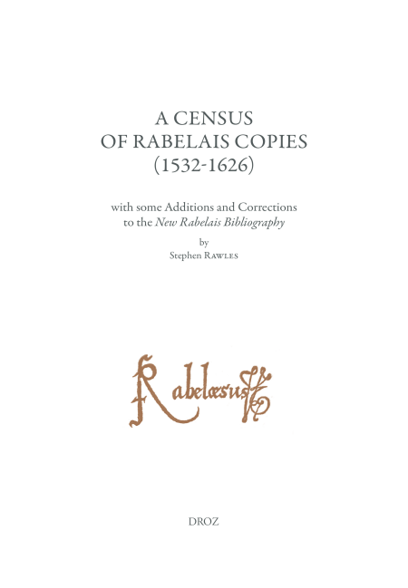 This Census of Rabelais Copies reflects the digital revolution in library cataloguing, incorporating a complete rechecking for early Rabelais copies, notably in the Worldcat database. Every copy recorded has been further verified in the catalogues of the individual libraries concerned. Alongside numerous corrections and additions to the 1987 publication, based on excellent bibliographical and more general scholarship, this Census increases the total number of known copies of Rabelais, dated between 1532 and 1626, and in public hands, from about 750 to nearly 1100, of which well over 100 are available for consultation on-line.