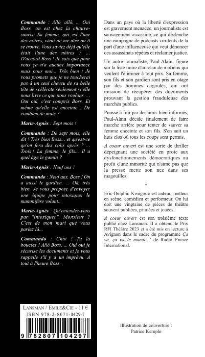 Dans un pays où la liberté d'expression est gravement menacée, un journaliste est sauvagement assassiné, ce qui déclenche une campagne de podcasts virulents de la part d'une influenceuse qui veut dénoncer ces assassinats répétés et réclamer justice. Un autre journaliste, Paul-Alain, figure sur la liste noire d'un clan de mafieux qui veulent l'éliminer à tout prix. Sa femme, son fils et son gardien sont pris en otage par des hommes cagoulés, qui ont mission de récupérer des documents prouvant la gestion frauduleuse des marchés publics. Poussé à fuir par des amis bien informés, Paul-Alain décide finalement de faire marche arrière pour tenter de sauver sa femme enceinte et son fils. S'en suit un huis clos où tous les coups sont permis. A cœur ouvert est une sorte de thriller dépeignant une société en proie aux dysfonctionnements démocratiques au profit d'une minorité qui n'aime pas que la presse mette son nez dans ses magouilles.