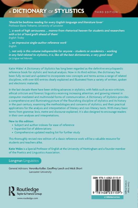 '...a work of high seriousness...manna from rhetorical heaven for students and researchers with a lot of hard graft ahead of them... '(English Today) '...an impressive single-author reference work... '(English) '...Not only is this volume indispensible for anyone, students or academics, working in any field related to stylistics, it is, like all the best dictionaries, a very good read...' (Le Lingue del Mondo) Over the past ten years there have been striking advances in stylistics. These have given rise to new terms and to revised thinking of concepts and re-definitions of terms. A Dictionary of Stylistics, 2nd Edition contains over 600 alphabeticlly listed entries: fully revised since the first and second editions, it contains many new entries. Drawing material from stylistics and a range of related disciplines such as sociolinguistics, cognitive linguistics and traditional rhetoric, the revised Third Edition provides a valuable reference work for students and teachers of stylistics, as well as critical discourse analysis and literary criticism. At the same time it provides a general picture of the nature, insights and methodologies of stylistics. As well as explaining terminology clearly and concisely, this edition contains a subject index for further ease of use. With numerous quotations; explanations for many basic terms from grammar and rhetoric; and a comprehensive bibliography, this is a unique reference work and handbook for stylistic and textual analysis. Students and teachers at secondary and tertiary levels of English language and literature or English as a foreign or second language, and of linguistics, will find it an invaluable source of information. Katie Wales is Professor of Modern English Language, University of Leeds and Dean of Learning and Teaching in the Faculty of Arts.