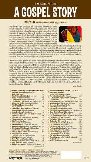 Une histoire du Gospel, racontée par Jean Buzelin, illustrée par Wozniak et Marjorie Guigue, accompagnée de 2 compact discs.<br /> L’Histoire des negro spirituals et des Gospel songs, c’est l’Histoire dramatique du peuple afro-américain tout entier depuis l’esclavage. Près de quatre siècles de souffrance endurés à cause du rejet, du racisme, de la violence, mais aussi de résistance, de lutte, et de foi intense et inébranlable de sa communauté dans l’espoir d’un monde meilleur qui, avant de représenter l’au-delà, commence par la reconnaissance ici-bas de ses droits, de sa dignité, de sa liberté. Une lutte jamais terminée malgré l’accession d’un ses membres à la présidence des Etats-Unis.<br /> La rencontre forcée entre l’héritage africain et les traditions européennes, par l’intermédiaire du christianisme, va donner naissance à un art vocal populaire totalement original, d’une beauté, d’une grandeur, d’une charge émotionnelle et d’une puissance expressive, qui va assurer la cohésion et la survie de la population noire, et lui donner la force et les armes nécessaires à son émancipation.<br /> Servis par des voix immenses, Mahalia Jackson, Louis Armstrong, Paul Robeson, Sister Rosetta Tharpe, Aretha Franklin, le Golden Gate Quartet... les chants sacrés vont constituer la base de toutes les musiques noires depuis plus d’un siècle : blues, jazz, rhythm and blues, rock ‘n’ roll, soul music, funk, rap ; ils résonnent à présent dans le monde entier. <br /> The history of Negro spirituals and gospels is also the dramatic history of Afro-Americans from the days of slavery to the present: almost four centuries of suffering, endured through rejection, racism and violence, but also four centuries of resistance, struggle, and intense, unshakeable faith. Their community had faith in their hope for a better world that, before Paradise, began here on Earth with recognition: of Afro-Americans’ rights to dignity and freedom. That struggle has never ended, despite a member of their people presiding over The United States. The forced encounter between African inheritance and European custom, through Christianity, would give birth to a popular vocal art that was totally original, an art whose beauty, grandeur, emotional charge and power of expression would ensure the consistency and survival of black people, giving it the strength and weapons necessary for emancipation. Served by immense voices — Mahalia Jackson, Louis Armstrong, Paul Robeson, Sister Rosetta Tharpe, Aretha Franklin, The Golden Gate Quartet — sacred songs would form the basis of all Black music for more than a century; and today the sounds of blues, jazz, rhythm and blues, rock ‘n’ roll, soul music, funk and rap are heard throughout the world.<br /><br /><br /> NEGRO SPIRITUALS / THE GREAT TRADITION<br /> 1 The Swan Silvertones Amazing Grace 2’42<br /> 2 Della Reese Amen 3’56<br /> 3 The Tuskegee Institute Choir Deep River 3’20<br /> 4 Evelyn Freeman: Didn’t It Rain 3’11<br /> 5 Brother John Sellers Down By The Riverside 3’19 <br /> 6 Sister Rosetta Tharpe Every Time I Feel The Spirit 2’18<br /> 7 Wings Over Jordan Ezechiel Saw The Wheel 2’12<br /> 8 The Original Gospel Harmonettes Get Away Jordan 2’45<br /> 9 The Angelic Gospel Singers & The Dixie Hummingbirds<br /> Glory Glory Hallelujah 3’29<br /> 10 Louis Armstrong Go Down Moses 3’38<br /> 11 The Stars Of Faith & The Bradford Singers<br /> Go Where I Send Thee 3’25<br /> 12 Odetta He’s Got The Whole World In His Hands 1’53<br /> 13 Marian Anderson Heav’n, Heav’n 2’14<br /> 14 The Pilgrim Travelers Joshua Fit The Battle Of Jericho 2’03<br /> 15 LaVern Baker Just A Closer Walk With Thee 3’11 <br /> 16 Paul Robeson Nobody Knows The Trouble I’ve Seen 2’41 <br /> 17 Ella Jenkins & The Goodwill Spiritual Choir<br /> Old Time Religion 2’11<br /> 18 The Fisk Jubilee Singers Rockin’ Jerusalem 2’11<br /> 19 The Golden Gate Quartet<br /> Sometimes I Feel Like A Motherless Child 3’14 <br /> 20 Sam Cooke Steal Away 2’29<br /> 21 Clara Ward Swing Low, Sweet Chariot 3’20<br /> 22 Rev Gary Davis Twelve Gates To The City 2’56<br /> 23 The Charioteers Wade In The Water 2’42<br /> 24 Mahalia Jackson When The Saints Go Marching In 3’56 <br /> durée totale 70’06<br /><br /> THE GOLDEN AGE OF GOSPEL / THE HITS<br /> 1 Sister Rosetta Tharpe<br /> Strange Things Happening Everyday 2’51<br /> 2 The Golden Gate Quartet Shadrack 2’39<br /> 3 St. Paul Church Baptist Choir of L.A. God Be With You 2’53<br /> 4 Reverend Kelsey Little Boy 2’40<br /> 5 Mahalia Jackson Move On Up A Little Higher 5’38<br /> 6 The Trumpeteers Milky White Way 2’32<br /> 7 Marie Knight What Could I Do 2’37<br /> 8 The Pilgrim Travelers Mother Bowed 2’54<br /> 9 The Angelic Gospel Singers Touch Me, Lord Jesus 3’00<br /> 10 Sister Rosetta Tharpe & Marie Knight<br /> Up Above My Head I Hear Music In The Air 2’32<br /> 11 The Roberta Martin Singers The Old Ship Of Zion 3’04<br /> 12 The Five Boys of Mississippi Our Father 2’53<br /> 13 The Ward Singers Surely God Is Able 3’00<br /> 14 Brother Joe May Search Me Lord 3’02<br /> 15 The Soul Stirrers Jesus Gave Me Water 2’28<br /> 16 Clara Ward Come In The Room 2’33<br /> 17 The Bells Of Joy Let’s Talk About Jesus 2’45<br /> 18 Professor Alex Bradford Too Close To Heaven 3’04<br /> 19 Sister Wynona Carr The Ball Game 3’07<br /> 20 The Orioles Crying In The Chapel 3’04<br /> 21 The Consolers Give Me My Flowers 2’40<br /> 22 The Staple Singers Uncloudy Day ( 3’00<br /> 23 James Cleveland & The Voices Of Tabernacle<br /> The Love Of God 3’55<br /> 24 Aretha Franklin Precious Lord 6’14<br /> durée totale 75’56<br />
