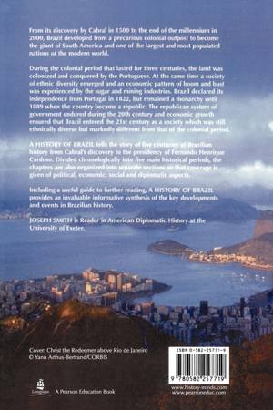From its discovery by Cabral in 1500 to the end of the millennium in 2000, Brazil developed from a precarious colonial outpost to become the giant of South America and one of the largest and most populated nations of the modern world. A History of Brazil tells the story of five centuries of Brazilian history from Cabral's discovery to the presidency of Fernando Henrique Cardoso. Divided chronologically into five main historical periods, the chapters are also organised into separate sections so that coverage is given of political, economic, social and diplomatic aspects. Including a useful Guide to Further Reading, the book provides an invaluable informative synthesis of the key developments and events in Brazilian history.