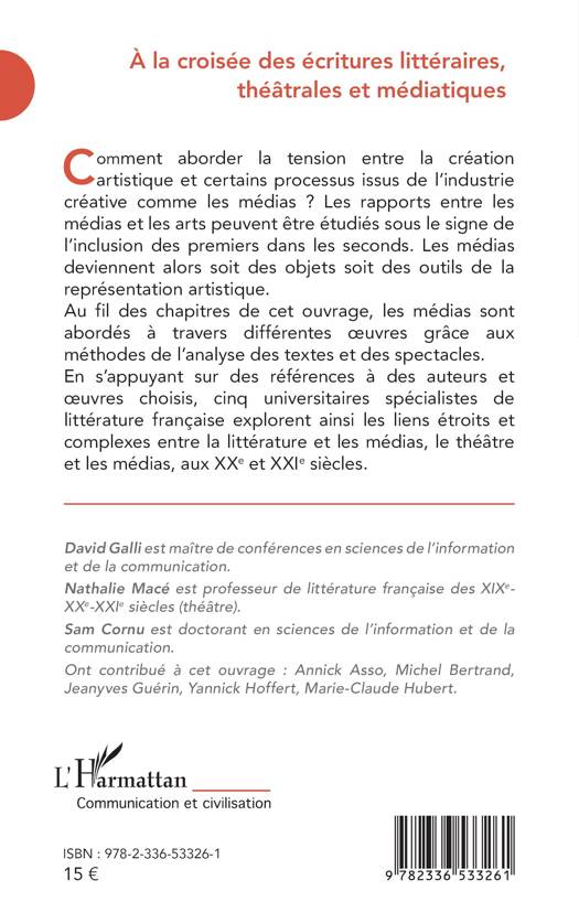 Comment aborder la tension entre la création artistique et certains processus issus de l'industrie créative comme les médias ? Les rapports entre les médias et les arts peuvent être étudiés sous le signe de l'inclusion des premiers dans les seconds. Les médias deviennent alors soit des objets soit des outils de la représentation artistique. Au fil des chapitres de cet ouvrage, les médias sont abordés à travers différentes oeuvres grâce aux méthodes de l'analyse des textes et des spectacles. En s'appuyant sur des références à des auteurs et oeuvres choisis, cinq universitaires spécialistes de littérature française explorent ainsi les liens étroits et complexes entre la littérature et les médias, le théâtre et les médias, aux XXe et XXIe siècles.