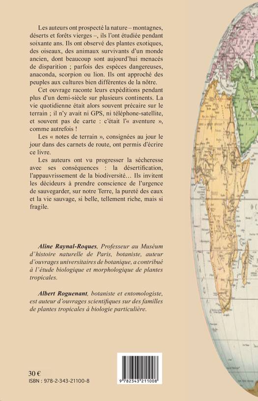 Ils ont prospecté la nature, l'ont étudiée pendant soixante ans. Ces deux chercheurs ont observé des plantes exotiques, des oiseaux, des animaux survivants, dont beaucoup sont aujourd'hui menacés de disparition ; parfois des espèces dangereuses. Ils ont approché des peuples aux cultures différentes de la nôtre. Cet ouvrage raconte leurs expéditions pendant plus d'un demi-siècle sur plusieurs continents. La vie quotidienne était alors souvent précaire sur le terrain ; il n'y avait ni GPS, ni téléphone-satellite, et souvent pas de carte : c'était l'aventure. C'est aussi un témoignage sur la progression de la sécheresse et ses conséquences, ainsi qu'une invitation pour que les décideurs prennent conscience de l'urgence de sauvegarder la pureté des eaux et la vie sauvage : belle, riche et si fragile.