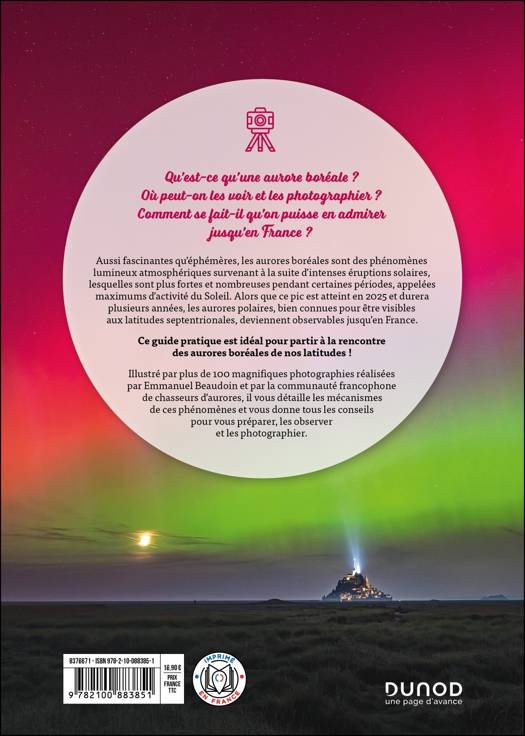 Qu'est-ce qu'une aurore boréale ? Où peut-on les voir et les photographier ? Comment se fait-il qu'on puisse en admirer jusqu'en France ? Aussi fascinantes qu'éphémères, les aurores boréales sont des phénomènes lumineux atmosphériques survenant à la suite d’intenses éruptions solaires, lesquelles sont plus fortes et nombreuses pendant certaines périodes, appelées maximums d’activité du Soleil. Alors que ce pic est atteint en 2025 et durera plusieurs années, les aurores polaires, bien connues pour être visibles aux latitudes septentrionales, deviennent observables jusqu’en France. Ce guide pratique est idéal pour partir à la rencontre des aurores boréales de nos latitudes ! Illustré par plus de 100 magnifiques photographies réalisées par Emmanuel Beaudoin et par la communauté francophone de chasseurs d’aurores, il vous détaille les mécanismes de ces phénomènes et vous donne tous les conseils pour vous préparer, les observer et les photographier.