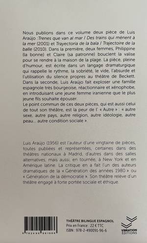 Nous publions dans ce volume deux pièces de Luis Araújo : Trenes que van al mar ;Des trains qui mènent à la mer (2001) et Trayectoria de la bala ; Trajectoire de la balle (2010). Dans la première, deux femmes, Philippine (la bonne) et Claire (sa patronne) bouclent la valise pour se rendre à la maison de la plage. La pièce, pleine d’humour, est écrite dans un langage dramaturgique qui rappelle le rythme, la sobriété, le vide, l’absurde et l’utilisation du silence propres au théâtre de Beckett. Dans la seconde, Luis Araújo fait exploser une famille espagnole très bourgeoise, réactionnaire et xénophobe, en introduisant une jeune femme iranienne que le plus jeune fils souhaite épouser. Le point commun de ces deux pièces, qui est aussi celui de tout son théâtre, est la peur de l’«Autre»;: «autre sexe, autre pays, autre religion, autre idéologie, autre peau... autre condition sociale».