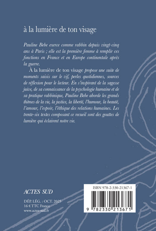 Pauline Bebe exerce comme rabbin depuis vingt-cinq ans à Paris ; elle est la première femme à remplir ces fonctions en France et en Europe continentale après la guerre. À la lumière de ton visage propose une suite de moments saisis sur le vif, perles quotidiennes, sources de réflexion pour le lecteur. En s'inspirant de la sagesse juive, de sa connaissance de la psychologie humaine et de sa pratique rabbinique, Pauline Bebe aborde les grands thèmes de la vie, la justice, la liberté, l'humour, la beauté, l'amour, l'espoir, l'éthique des relations humaines. Les trente-six textes composant ce recueil sont des gouttes de lumière qui éclairent notre vie.