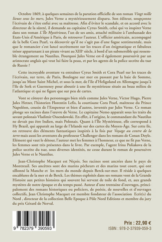 Un livre d'aventures et d'histoire qui met en scène un Jules Verne mystérieux. En 1869, à quelques semaines de la sortie de "Vingt mille lieues sous les mers", Jules Verne a disparu. Son éditeur pense qu'il s'est enfui avec sa maîtresse et pour ne pas alerter la police, charge de rechercher l'écrivain, le capitaine Cyrus, officier américain, celui-là même qui va inspirer l'écrivain plus tard dans " l'Ile mystérieuse". Il va retrouver Verne, à cette époque résidant au Crotoy, qui est parti à bord du Nautilus à la recherche d'un trésor vers les îles d'Hélioland, de Sercq, la mystérieuse Hy-Brasil, sans oublier de passer par le connu mais étrange Mont Saint-Michel. On y rencontrera des créatures fantasmagoriques auxquelles Verne devra faire face. Dans sa course au trésor, il doit devancer les services anglais et russes qui veulent détruire le Nautilus et le traquent dans les mers. Jules vernes n'a pas fini de nous surpendre. Un livre d'aventures inattendues
