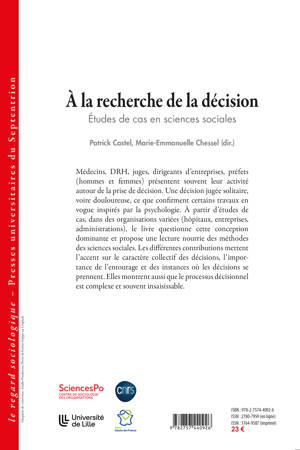 Médecins, DRH, juges, dirigeants d’entreprises, préfets (hommes et femmes) présentent souvent leur activité autour de la prise de décision. Une décision jugée solitaire, voire douloureuse, ce que confirment certains travaux en vogue inspirés par la psychologie. À partir d’études de cas, dans des organisations variées (hôpitaux, entreprises, administrations), le livre questionne cette conception dominante et propose une lecture nourrie des méthodes des sciences sociales. Les différentes contributions mettent l’accent sur le caractère collectif des décisions, l’importance de l’entourage et des instances où les décisions se prennent. Elles montrent aussi que le processus décisionnel est complexe et souvent insaisissable.
