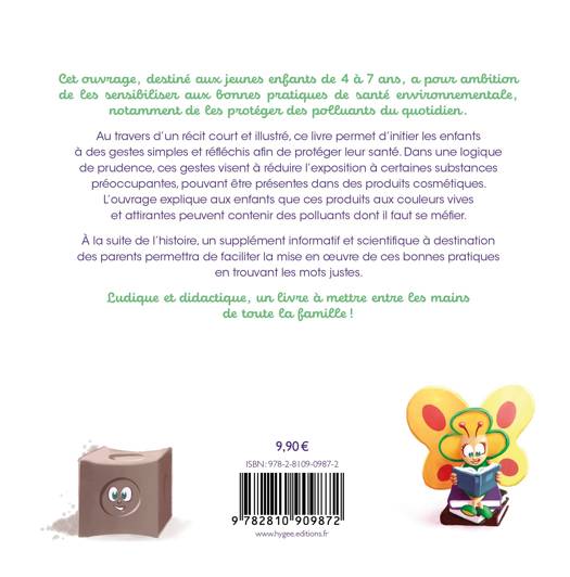 Cet ouvrage, destiné aux jeunes enfants de 4 à 7 ans, a pour ambition de les sensibiliser aux bonnes pratiques de santé environnementale, notamment de les protéger des polluants du quotidien. Au travers d’un récit court et illustré, ce livre permet d’initier les enfants à des gestes simples et réfléchis afin de protéger leur santé. Dans une logique de prudence, ces gestes visent à réduire l’exposition à certaines substances préoccupantes, pouvant être présentes dans des produits cosmétiques. L’ouvrage explique aux enfants que ces produits aux couleurs vives et attirantes peuvent contenir des polluants dont il faut se méfier. À la suite de l’histoire, un supplément informatif et scientifique à destination des parents permettra de faciliter la mise en oeuvre de ces bonnes pratiques en trouvant les mots justes. Ludique et didactique, un livre à mettre entre les mains de toute la famille !