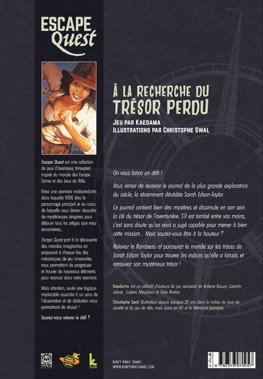 On vous lance un défi ! vous venez de recevoir le journal de la plus grande exploratrice du siècle, la récemment décédée Sarah Edson-Taylor. Ce journal contient bien des mystères et dissimule en son sein la clé du trésor de l'aventurière. S'il est tombé entre vos mains, c'est sans doute qu'on vous a jugé capable de mener à bien cette mission... Mais saurez-vous être à la hauteur ? Relevez le flambeau et parcourez le monde sur les traces de Sarah Edson-Taylor pour trouver les indices qu'elle a laissés et retrouvez son mystérieux trésor !