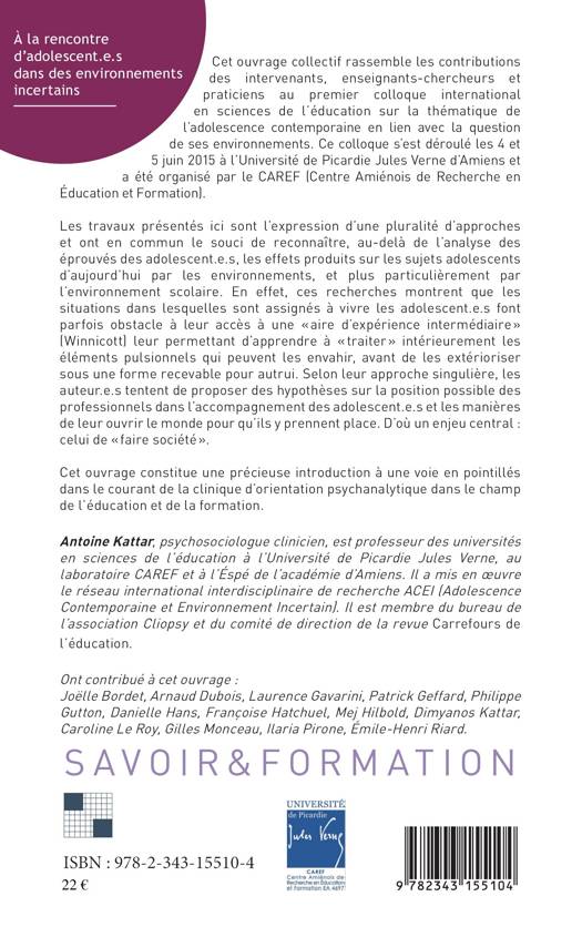 Comment les adolescent.e.s d'aujourd'hui tentent de garantir la continuité de leur sentiment d'exister quand ils sont confrontés à un environnement qui vacille ? Quelles sont leurs angoisses à l'oeuvre ? Qu'est-ce qui pèse sur eux dans la réalité de l'environnement et peut se heurter à leurs peurs fantasmatiques ? Comment aller à leur rencontre ? Comment appréhender la souffrance psychique des sujets dans notre société hyper moderne ?