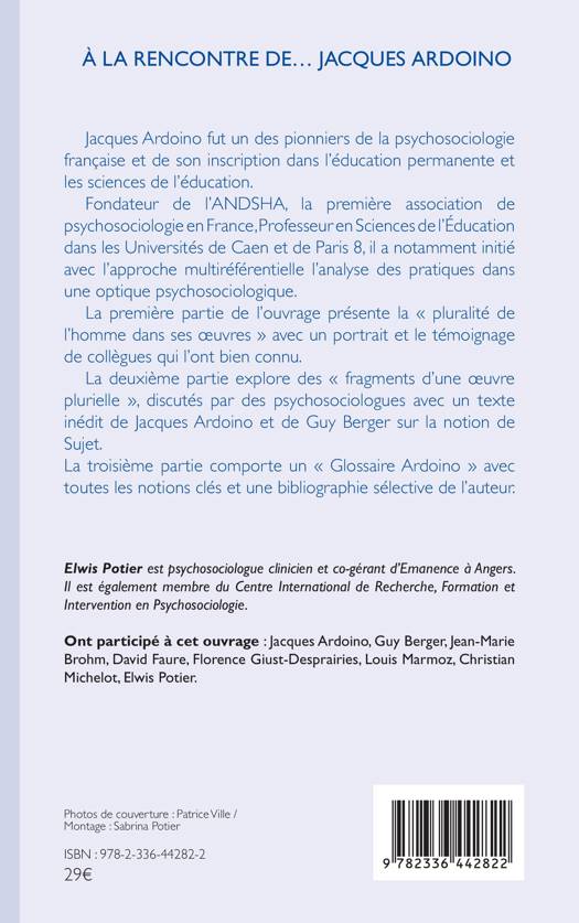 Jacques Ardoino fut un des pionniers de la psychosociologie française et de son inscription dans l'éducation permanente et les sciences de l'éducation. Fondateur de l'ANDSHA, la première association de psychosociologie en France, Professeur en Sciences de l'Éducation dans les Universités de Caen et de Paris 8, il a notamment initié avec l'approche multiréférentielle l'analyse des pratiques dans une optique psychosociologique. La première partie de l'ouvrage présente la pluralité de l'homme dans ses oeuvres avec un portrait et le témoignage de collègues qui l'ont bien connu. La deuxième partie explore des fragments d'une oeuvre plurielle, discutés par des psychosociologues avec un texte inédit de Jacques Ardoino et de Guy Berger sur la notion de Sujet. La troisième partie comporte un Glossaire Ardoino avec toutes les notions clés et une bibliographie sélective de l'auteur.