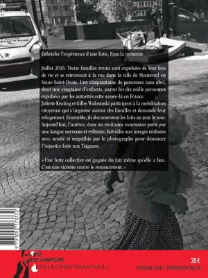 À la rue est un témoignage sur l’engagement, un livre de colère et d’espoir. <br /> Été 2016, treize familles roms sont expulsées de leur lieu de vie et se retrouvent dehors dans la ville de Montreuil en Seine-Saint-Denis. Une cinquantaine de personnes sans abri, dont une vingtaine d’enfants, parmi les dix mille expulsées par les autorités cette année-là en France. L’autrice Juliette Keating et le photographe Gilles Walusinski participent à la mobilisation citoyenne qui s’organise autour des familles et demande leur relogement. À la rue est à la fois un récit littéraire et réflexif sur l’expérience de l’engagement collectif et le recueil de documents qui ont valeur de témoignages.<br /><br /><br /> À la rue se compose de deux parties complémentaires articulées autour d’un cahier de 32 photographies noir & blanc :<br /> La première, « Débrief », texte littéraire et politique, a la forme d’un poème narratif dans lequel l’autrice revient sur son engagement de plusieurs années auprès de familles rroms, sur ce que cette expérience bouleverse dans le cours de sa vie, remue en elle. Elle questionne les mobiles de cet engagement, y cherche les raisons profondes et décrit les mécanismes de la discrimination tels qu’elle les constate en accompagnant une famille dans l’ouverture de ses droits sociaux. <br /> Si l’éternel engrenage des évictions, le délitement de la mobilisation collective face au pouvoir politique qui joue le jeu du pourrissement, et le découragement qui peut s’ensuivre sont présents dans le texte, c’est l’énergie que procure le collectif et la force des rencontres qu’il occasionne qui l’emportent. Même si l’issue n’est pas ce que l’on voudrait qu’elle soit, une lutte collective est gagnée du fait même qu’elle a lieu. C’est une victoire contre le renoncement. Dans une langue nerveuse, rythmée, sans concession Juliette Keating dénonce un état du monde fondé sur l’injustice.<br /><br /> La seconde, « Dehors », est le recueil de documents produits entre 2016 et 2018 : des extraits d’articles écrits dans un blog de l’autrice hébergé par Mediapart. <br /> L’événement que constitue l’expulsion des familles et leur errance dans la ville est consigné régulièrement, avec ses lenteurs, ses coups de théâtres, ses petites victoires, ses promesses et faux espoirs. Présentés dans l’ordre chronologique, ces textes sont les traces attestant de la réalité des événements, une partie de leur mémoire.<br /><br /> Fixer la mémoire, le cahier central de photographies réalisées par Gilles Walusinski réunit des images de la mobilisation et des familles, qui sont autant de documents témoins. Ces images puisent leur force dans la saisie d’instantanés pendant une période continue de plusieurs mois, qui racontent, montrent, et dénoncent une réalité indéniable. Ainsi est documentée la vie à la rue mais aussi la force de caractère, l’énergie de ceux et celles bien décidés à lutter pour leurs droits. Loin des stéréotypes associés aux images exotiques des Tsiganes, les photographies de Gilles Walusinski sont des témoignages réalisés avec précision, acuité et empathie.<br />