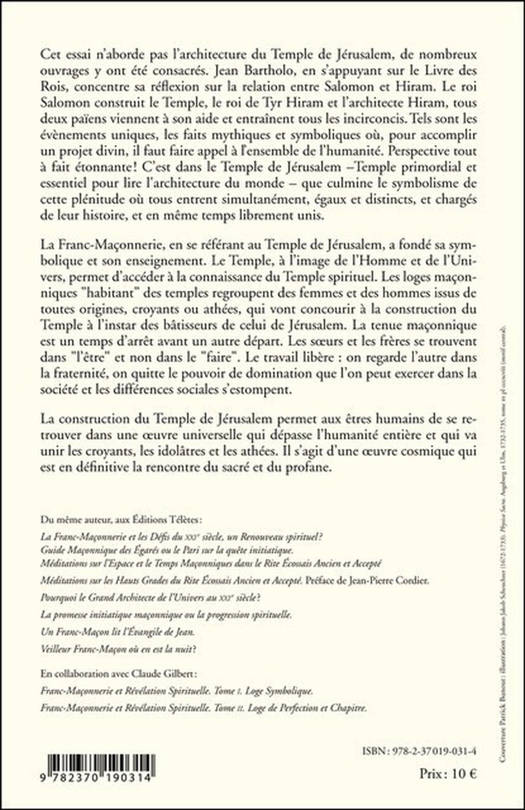 Cet essai n’aborde pas l’architecture du Temple de Jérusalem, de nombreux ouvrages y ont été consacrés. Jean Bartholo, en s’appuyant sur le Livre des Rois, concentre sa réflexion sur la relation entre Salomon et Hiram. Le roi Salomon construit le Temple, le roi de Tyr Hiram et l’architecte Hiram, tous deux païens viennent à son aide et entraînent tous les incirconcis. Tels sont les évènements uniques, les faits mythiques et symboliques où, pour accomplir un projet divin, il faut faire appel à l’ensemble de l’humanité. Perspective tout à fait étonnante?! C’est dans le Temple de Jérusalem –Temple primordial et essentiel pour lire l'architecture du monde – que culmine le symbolisme de cette plénitude où tous entrent simultanément, égaux et distincts, et chargés de leur histoire, et en même temps librement unis. La Franc-Maçonnerie, en se référant au Temple de Jérusalem, a fondé sa symbolique et son enseignement. Le Temple, à l’image de l’Homme et de l’Univers, permet d’accéder à la connaissance du Temple spirituel. Les loges maçonniques "habitant" des temples regroupent des femmes et des hommes issus de toutes origines, croyants ou athées, qui vont concourir à la construction du Temple à l’instar des bâtisseurs de celui de Jérusalem. La tenue maçonnique est un temps d’arrêt avant un autre départ. Les sœurs et les frères se trouvent dans "l’être" et non dans le "faire". Le travail libère : on regarde l’autre dans la fraternité, on quitte le pouvoir de domination que l’on peut exercer dans la société et les différences sociales s’estompent. La construction du Temple de Jérusalem permet aux êtres humains de se retrouver dans une œuvre universelle qui dépasse l’humanité entière et qui va unir les croyants, les idolâtres et les athées. Il s’agit d’une œuvre cosmique qui est en définitive la rencontre du sacré et du profane.