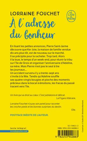 En lisant les petites annonces, Pierre Saint-Jarme découvre que Ker Joie, la maison de famille vendue dix ans plus tôt, est de nouveau sur le marché. Il se précipite pour la racheter. Trop tard. Alors il la loue, le temps d’un week-end, pour réunir la tribu sur l’île de Groix et organiser l’anniversaire d’Adeline, sa mère. Mais Pierre n’est pas le seul à lire les journaux... Un accident survenu il y a trente-sept ans s’invite à la fête. Tandis qu’Adeline souffle ses quatre-vingts bougies et pioche des moments précieux dans le bocal à émotions, les fracas du passé tracent vers l’île.