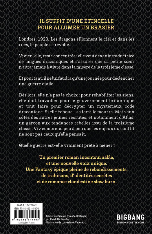 Dès lors, elle n'a pas le choix : pour réhabiliter les siens, elle doit travailler pour le gouvernement britannique et tout faire pour décrypter un mystérieux code draconique. Si elle échoue... sa famille mourra. Mais aux côtés des autres jeunes recrutés, et notamment d'Atlas, un garçon aux tendances rebelles issu de la troisième classe, Viv comprend peu à peu que les enjeux du conflit ne sont pas ceux qu'elle pensait.