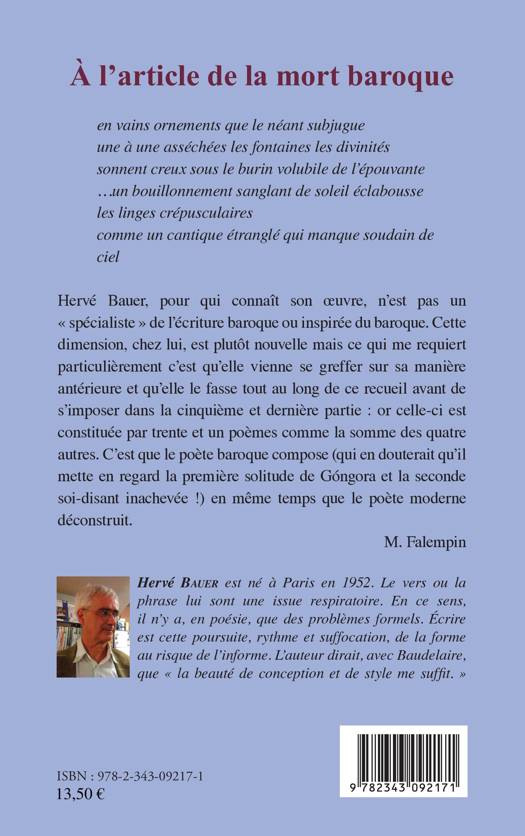 Hervé Bauer, pour qui connaît son uvre, n'est pas un « spécialiste » de l'écriture baroque ou inspirée du baroque. Cette dimension, chez lui, est plutôt nouvelle mais ce qui me requiert particulièrement c'est qu'elle vienne se greffer sur sa manière antérieure et qu'elle le fasse tout au long de ce recueil. C'est que le poète baroque compose en même temps que le poète moderne déconstruit. - M. Falempin