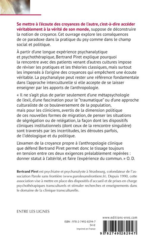 Se mettre à l'écoute des croyances de l'autre, c'est-à-dire accéder véritablement à la vérité de son monde, suppose de déconstruire la notion de croyance. Cet ouvrage explore les conséquences de ce paradoxe dans la pratique du psy comme dans le champ social et politique.