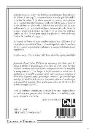 à l’exemple du beurre est une parabole féroce sur l’alliance d’un capitalisme sans états d’âme et d’un état policier sûr de son bon droit. comme toujours chez schmalz, la langue est étonnement expressive.