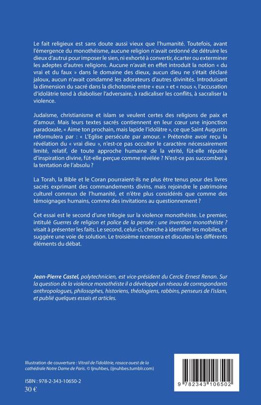 Avant l'émergence du monothéisme, aucune religion n'avait ordonné de détruire les dieux d'autrui pour imposer le sien, ni exhorté à convertir ou exterminer les adeptes d'autres religions. Judaïsme, christianisme et islam se veulent certes des religions de paix et d'amour, mais leurs textes sacrés contiennent en leur coeur une injonction paradoxale "Aime ton prochain, mais lapide l'idolâtre". Torah, Bible, Coran pourraient-ils ne plus être tenus pour des livres sacrés et n'être plus considérés que comme des témoignages humains, comme des invitations au questionnement ?
