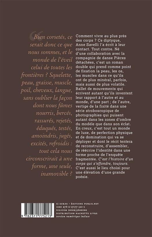 Tout contre. Né d'une collaboration avec la compagnie de danse Pièces détachées, c'est un roman double qui prend comme point de fixation la peau, les os, les muscles dans ce qu'ils ont de plus minéral, parfois, mais aussi de plus volatile. Ballet de mouvements qui écrivent autant qu'ils inventent leur rapport à l'autre et au monde, d'une part ; de l'autre, vertige de la fixité dans une série stroboscopique de photographies qui puisent autant dans les zones d'ombre du modèle que dans son éclat. En creux, c'est tout un monde de luxe, de perfection physique et de domination qui va se déployer et dont le récit tentera de reconstruire, d'assembler, de réécrire l'identité dans une forme proche de l'enquête fragmentée.