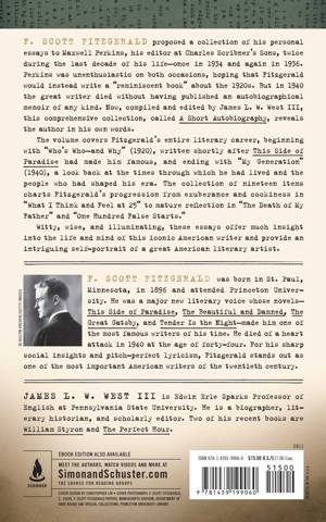 A self-portrait of a great writer.A Short Autobiography charts Fitzgerald's progression from exuberant and cocky with "What I think and Feel at 25", to mature and reflective with "One Hundred False Starts" and "The Death of My Father." Compiled and edited by Professor James West, this revealing collection of personal essays and articles reveals the beloved author in his own words.