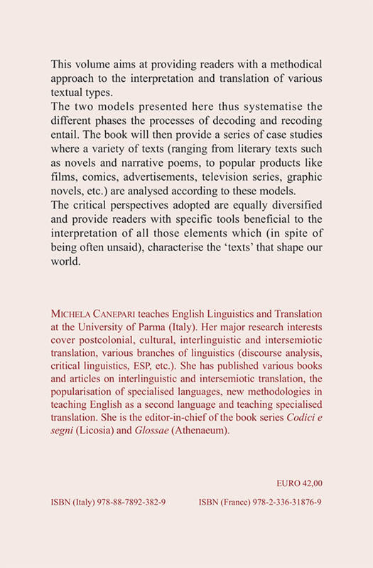 The two models presented here thus systematise the different phases the processes of decoding and recoding entail. The book will then provide a series of case studies where a variety of texts (ranging from literary texts such as novels and narrative poems, to popular products like films, comics, advertisements, television series, graphic novels, etc.) are analysed according to these models.