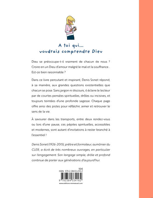 Illustrées de dessins humoristiques, une sélection de pensées du père Denis Sonet autour de thèmes aussi divers que la souffrance, le pardon ou l'engagement.