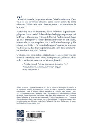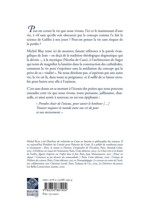 Peut-on cerner la vie que nous vivons, l'ici et le maintenant d'une vie, a vif sans qu'elle soit obscurcie par le concept comme l'a fait la science de Galilee a nos jours ? Peut-on penser la vie sans risquer de la perdre ? Michel Blay tente ici de montrer, faisant reference a la parole evangelique de Jean - en deca de la tradition theologique dogmatique qui la devoie -, a la mystique (Nicolas de Cues), a l'architecture de Suger qui tente de magnifier la lumiere dans la construction des cathedrales, comment la vie peut s'exprimer sans la mediation du concept qui la prive de sa vitalite. Ne nous desolons pas, n'esperons pas une autre vie, la vie est la, dans toute sa pregnance, et il suffit de se laisser envahir pour battre avec elle a l'unisson. C'est sans doute en se mettant a l'ecoute des poetes que nous pouvons entendre cette vie que nous vivons, toute puissante, jaillissante, charnelle, et ainsi sentir a nouveau en soi son epiphanie: Prendre chair de l'oiseau, pour savoir le bonheur [...] Trouver toujours le monde entre son cri de peur et son ravissement.