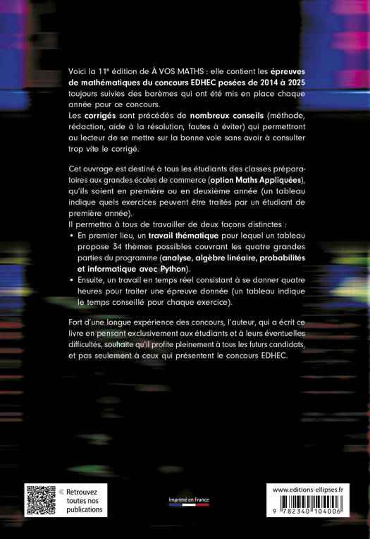 Voici la 11e édition de À VOS MATHS : elle contient les épreuves de mathématiques du concours EDHEC posées de 2014 à 2025 toujours suivies des barèmes qui ont été mis en place chaque année pour ce concours.