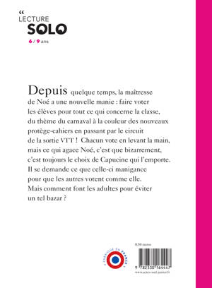 Depuis quelque temps, la maîtresse de Noé a une nouvelle manie : faire voter les élèves pour tout ce qui concerne la classe, du thème du carnaval à la couleur des nouveaux protège-cahiers en passant par le circuit de la sortie VTT ! Chacun vote en levant la main, mais ce qui agace Noé, c'est que bizarrement, c'est toujours le choix de Capucine qui l'emporte. Il se demande ce que celle- ci manigance pour que les autres votent comme elle. Mais comment font les adultes pour éviter un tel bazar ?