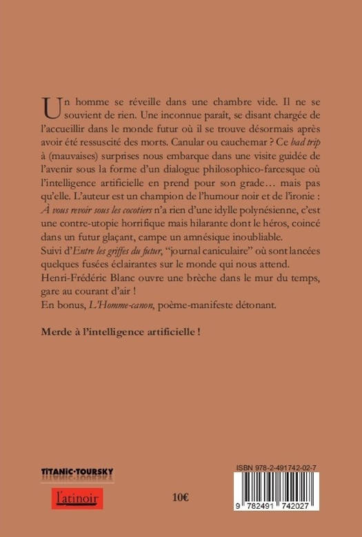 Un homme se réveille dans une vaste chambre vide. Qui est-il ? Il ne s'en souvient pas. Seuls émergent dans son esprit quelques vagues images de meetings politiques... Une inconnue apparaît, se disant chargée de l'accueillir dans le monde futur où il se trouve désormais, après avoir été ressuscité des morts. Canular ou cauchemar ? Ce bad trip nous embarque dans une visite guidée de l'avenir sous la forme d'un dialogue philosophico-burlesque que n'auraient renié ni Swift ni Ionesco, où l'intelligence artificielle en prend pour son grade. Contre-utopie terrifique et tordante dont le héros, politicien coincé dans un futur glaçant, est un amnésique inoubliable. Merde à l'intelligence artificielle !