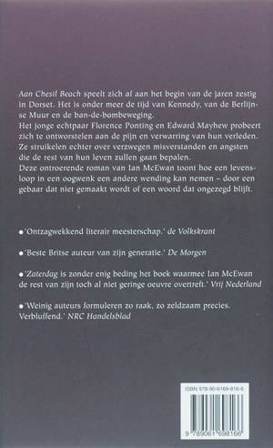 Aan Chesil Beach speelt zich af aan het begin van de jaren zestig in Dorset. Het is onder meer de tijd van Kennedy, van de Berlijnse Muur en de ban-de-bombeweging. Het jonge echtpaar Florence Ponting en Edward Mayhew probeert zich te ontworstelen aan de pijn en verwarring van hun verleden. Ze struikelen echter over verzwegen misverstanden en angsten die de rest van hun leven zullen gaan bepalen. Deze ontroerende roman van Ian McEwan toont hoe een levensloop in een oogwenk een andere wending kan nemen - door een gebaar dat niet gemaakt wordt of een woord dat ongezegd blijft. 'Ontzagwekkend literair meesterschap.' de Volkskrant 'Beste Britse auteur van zijn generatie.' De Morgen 'Zaterdag is zonder enig beding het boek waarmee Ian McEwan de rest van zijn toch al niet geringe oeuvre overtreft.' Vrij Nederland 'Weinig auteurs formuleren zo raak, zo zeldzaam precies. Verbluffend.' NRC Handelsblad