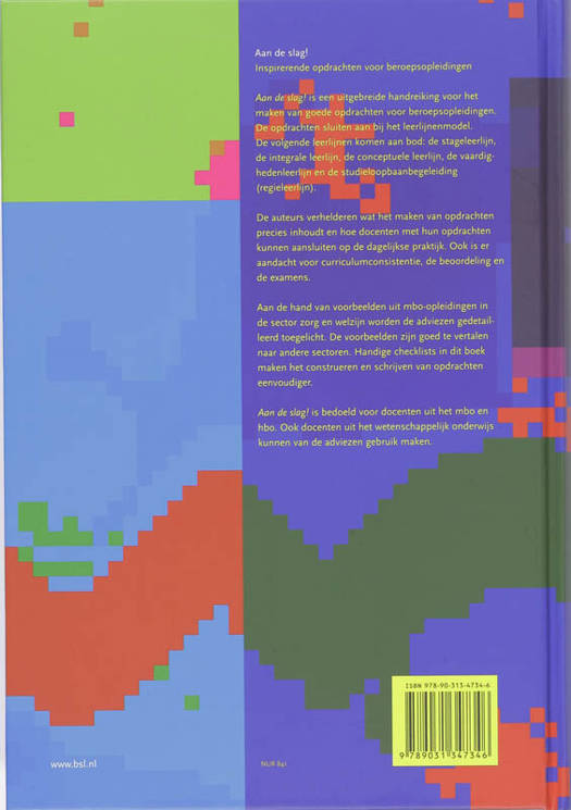 Aan de slag! is een uitgebreide handreiking voor het maken van goede opdrachten voor beroepsopleidingen. De opdrachten sluiten aan bij het leerlijnenmodel. De volgende leerlijnen komen aan bod: de stageleerlijn, de integrale leerlijn, de conceptuele leerlijn, de vaardighedenleerlijn en de studieloopbaanbegeleiding (regieleerlijn).De auteurs verhelderen wat het maken van opdrachten precies inhoudt en hoe docenten met hun opdrachten kunnen aansluiten op de dagelijkse praktijk. Ook is er aandacht voor curriculumconsistentie, de beoordeling en de examens.Aan de hand van voorbeelden uit mbo–opleidingen in de sector zorg en welzijn worden de adviezen gedetailleerd toegelicht. De voorbeelden zijn goed te vertalen naar andere sectoren. Handige checklists in dit boek maken het construeren en schrijven van opdrachten eenvoudiger.