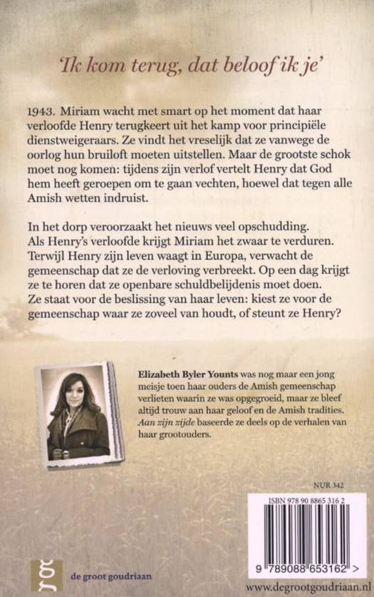 Elizabeth Byler Younts schreef met Aan zijn zijde een Amish roman met een nieuwe insteek: geloven in tijden van oorlog. Miriams verloofde Henry wordt na het uitbreken van de WOII naar een kamp voor gewetensbezwaarden gestuurd. Tijdens een verlof vertelt hij haar dat God hem heeft geroepen om te gaan vechten, hoewel dat tegen de wetten van de Amish in gaat. In het dorp veroorzaakt het nieuws veel opschudding. Als Henry s verloofde krijgt Miriam het zwaar te verduren. Iedereen verwacht dat ze de verloving verbreekt. Op een dag wordt haar gezegd dat ze openbare schuldbelijdenis moet doen. Ze staat voor de beslissing van haar leven: kiest ze voor de gemeenschap waar ze zoveel van houdt, of steunt ze Henry?