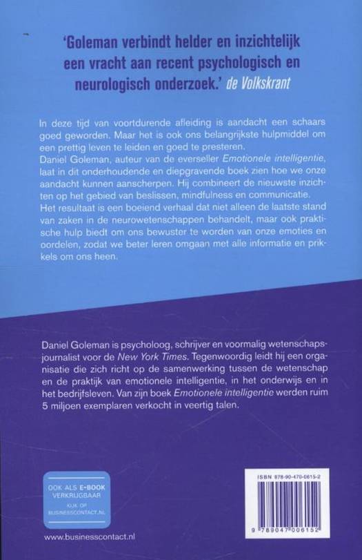 In deze tijd van voortdurende afleiding is aandacht een schaars goed geworden. Maar het is ook ons belangrijkste hulpmiddel om een prettig leven te leiden en goed te presteren. Daniel Goleman, auteur van de everseller Emotionele intelligentie, laat in dit onderhoudende en diepgravende boek zien hoe we onze aandacht kunnen aanscherpen. Hij combineert de nieuwste inzichten op het gebied van beslissen, mindfulness en communicatie. Het resultaat is een boeiend verhaal dat niet alleen de laatste stand van zaken in de neurowetenschappen behandelt, maar ook praktische hulp biedt om ons bewuster te worden van onze emoties en oordelen, zodat we beter leren omgaan met alle informatie en prikkels om ons heen.