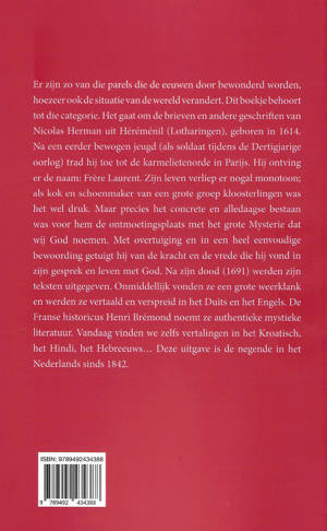 Er zijn zo van die parels die de eeuwen door bewonderd worden, hoezeer ook de situatie van de wereld verandert. Dit boekje behoort tot die categorie. Het gaat om de brieven en andere geschriften van Nicolas Hermann uit Héréménil (Lotharingen), geboren in 1614. Na een eerder bewogen jeugd (als soldaat tijdens de Dertigjarige oorlog) trad hij toe tot de karmelietenorde in Parijs. Hij ontving er de naam: Frère Laurent. Zijn leven verliep er nogal monotoon; als kok en schoenmaker van een grote groep kloosterlingen was het wel druk. Maar precies het concrete en alledaagse bestaan was voor hem de ontmoetingsplaats met het grote Mysterie dat wij God noemen. Met overtuiging en in een heel eenvoudige bewoording getuigt hij van de kracht en de vrede die hij vond in zijn gesprek en leven met God. Na zijn dood (1691) werden zijn teksten uitgegeven. Onmiddellijk vonden ze een grote weerklank en werden ze vertaald en verspreid in het Duits en het Engels. De Franse historicus Henri Brémond noemt ze authentieke mystieke literatuur. Vandaag vinden we zelfs vertalingen in het Kroatisch, het Hindi, het Hebreeuws… Deze uitgave is de negende in het Nederlands sinds 1842.