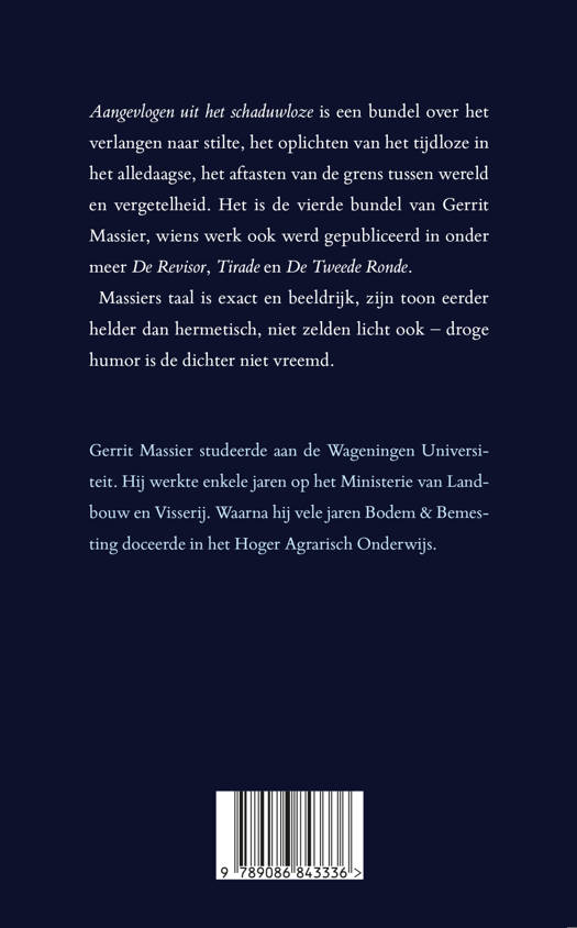 Aangevlogen uit het schaduwloze is een bundel over het verlangen naar stilte, het oplichten van het tijdloze in het alledaagse, het aftasten van de grens tussen wereld en vergetelheid. Het is de vierde bundel van Gerrit Massier, wiens werk ook werd gepubliceerd in onder meer De Revisor, Tirade en De Tweede Ronde. Massiers taal is exact en beeldrijk, zijn toon eerder helder dan hermetisch, niet zelden licht ook – droge humor is de dichter niet vreemd.