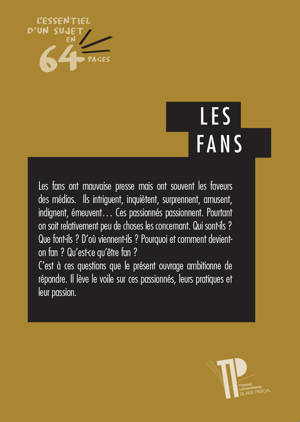 Les fans ont mauvaise presse mais ont souvent les faveurs des médias. Ils intriguent, inquiètent, surprennent, amusent, indignent, émeuvent… Ces passionnés passionnent. Pourtant, on sait relativement peu de choses les concernant. Qui sont-ils Que font-ils ? D'où viennent-ils ? Pourquoi et comment devient-on fan ? Qu’est-ce qu’être fan ? Quel en est le prix à payer ? Peut-on en retirer quelque profit ? Être fan est-il dangereux, pour soi ou pour les autres ? C’est à ces questions que le présent ouvrage ambitionne de répondre. Il lève le voile sur ces passionnés, leurs pratiques et leur passion.