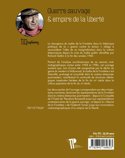 La résurgence du mythe de la Frontière dans la rhétorique politique de la « guerre contre la terreur » oblige à reconsidérer l'idée de sa marginalisation dans la culture étatsunienne depuis la crise du mythe public identifiée par Richard Slotkin à la fin des années 1960.Partant de l'analyse sociohistorique de six œuvres cinématographiques sorties entre 1968 et 1986, cet ouvrage soutient que, loin d’avoir été marginalisé par le déclin du genre du western à Hollywood, le mythe de la Frontière s’est diversifié, prolongé et consolidé dans le cinéma étatsunien post-western, manifestant la continuité de structures idéologiques impériales héritées de la fin du XIXe siècle dans la culture populaire de la fin du XXe.Les deux parties de l’ouvrage correspondent aux deux trajectoires narratives dominant les représentations de la Frontière dans le cinéma étatsunien post-western: depuis la Conquête de l’Ouest de Theodore Roosevelt jusqu’aux représentations contemporaines de la guerre sauvage; et depuis la « théorie de la Frontière » de Frederick Turner jusqu’aux incarnations cinématographiques d’un empire de la liberté.