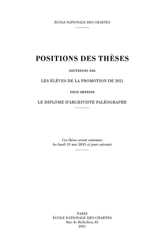 Les Positions des thèses soutenues par les élèves pour obtenir le diplôme d'archiviste paléographe sont publiées annuellement par l'École des chartes depuis 1849. Elles regroupent des résumés longs des thèses soutenues lors de l'année en cours.