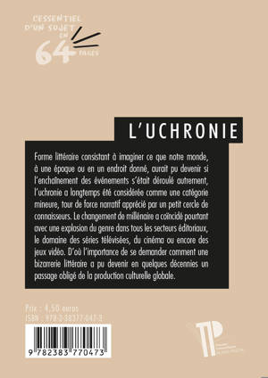 Forme littéraire consistant à imaginer ce que notre monde, à une époque ou en un endroit donnés, aurait pu devenir si l'enchaînement des événements s'était déroulé autrement, l'uchronie a longtemps été considérée comme une catégorie mineure, tour de force narratif apprécié par un petit cercle de connaisseurs. Le changement de millénaire a coïncidé pourtant avec une explosion du genre dans tous les secteurs éditoriaux : séries télévisées, cinéma, jeux vidéo... Comment une bizarrerie littéraire est-elle devenue en quelques décennies un passage obligé de la production culturelle globale ? Que nous dit un tel succès de l’imaginaire collectif du Troisième Millénaire ?