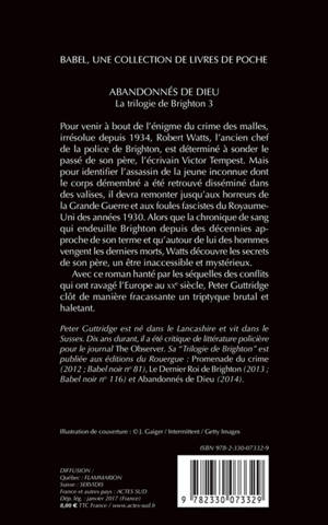Pour venir à bout de l'énigme du crime des malles, irrésolue depuis 1934, Robert Watts, l'ancien chef de la police de Brighton, est déterminé à sonder le passé de son père, l'écrivain Victor Tempest. Mais pour identifier l'assassin de la jeune inconnue dont le corps démembré a été retrouvé disséminé dans des valises, il devra remonter jusqu'aux horreurs de la Grande Guerre et aux foules fascistes du Royaume-Uni des années 1930. Alors que la chronique de sang qui endeuille Brighton depuis des décennies approche de son terme et qu'autour de lui des hommes vengent les derniers morts, Watts découvre les secrets de son père, un être inaccessible et mystérieux. Avec ce roman hanté par les séquelles des conflits qui ont ravagé l'Europe au xxe siècle, Peter Guttridge clôt de manière fracassante un triptyque brutal et haletant.