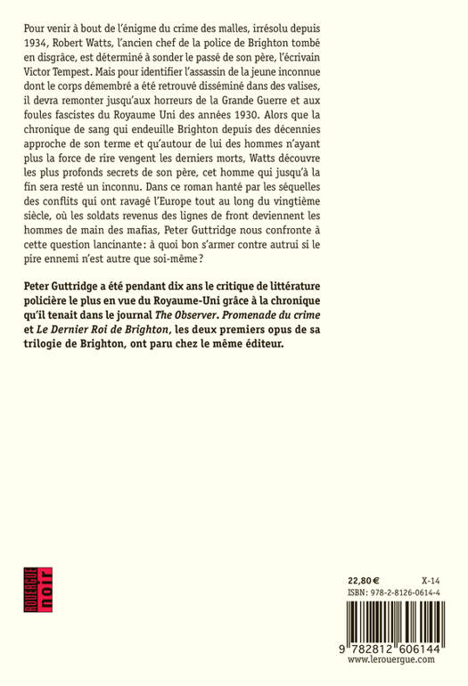 Pour venir à bout de l'énigme du crime des malles, irrésolu depuis 1934, Robert Watts, l'ancien chef de la police de Brighton tombé en disgrâce, est déterminé à sonder le passé de son père, l'écrivain Victor Tempest. Mais pour identifier l'assassin de la jeune inconnue dont le corps démembré a été retrouvé disséminé dans des valises, il devra remonter jusqu'aux horreurs de la Grande Guerre et aux foules fascistes du Royaume Uni des années 1930. Alors que la chronique de sang qui endeuille Brighton depuis des décennies approche de son terme et qu'autour de lui des hommes n'ayant plus la force de rire vengent les derniers morts, Watts découvre les plus profonds secrets de son père, cet homme qui jusqu'à la fin sera resté un inconnu. Dans ce roman hanté par les séquelles des conflits qui ont ravagé l'Europe tout au long du vingtième siècle, où les soldats revenus des lignes de front deviennent les hommes de main des mafias, Peter Guttridge nous confronte à cette question lancinante : à quoi bon s'armer contre autrui si le pire ennemi n'est autre que soi-même ?