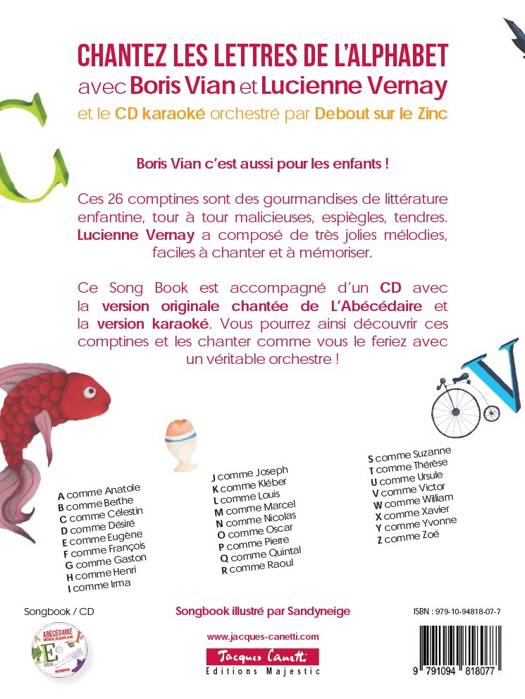 Ces 26 textes de Boris Vian sont des petites gourmandises de littérature enfantine, tour à tour malicieuses, espiègles, tendres. Sur les musiques de Lucienne Vernay, arrangées par les musiciens de Debout sur le Zinc, les lettres de l’alphabet sont amusantes à chanter.