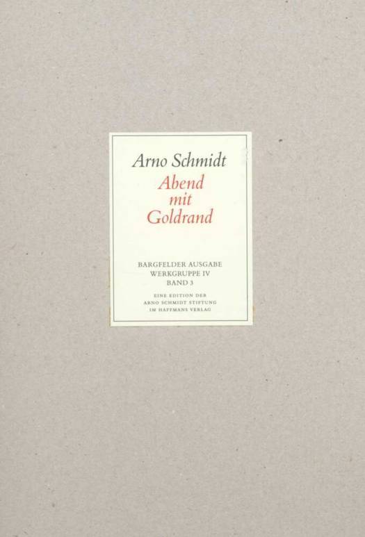Wie Die Schule der Atheisten ist auch der 1975 veröffentlichte Abend mit Goldrand ein Dialogroman, doch entführt die MärchenPosse - so die Genrebezeichnung - mit ihren 55 Bildern den Leser nicht in eine phantastische Zukunft, sondern in die Gegenwart des fiktiven Heidenests Klappendorf im Jahr 1974. Drei alte Männer, alle-samt Abschattungen ihres Schöpfers Arno Schmidt, beherrschen die Szenerie: der Militärexperte Eugen Fohrbach, der Bibliothekar Egon Olmers und der Schriftsteller Alexander Ottokar Gläser, genannt A&O. Den drei literaturversessenen Rentiers zur Seite stehen Fohrbachs Frau Grete, beider Stieftochter Martina und die Haushälterin Asta Reichelt. Das Geschehen gerät in Bewegung mit der Ankunft einer Gruppe von Hippies, die auf dem Weg nach Tasmanien drei Tage in dem Dörfchen ihr Lager aufschlägt. Deren geisterhafte Anführerin Ann' Ev' und der intellektuelle Kopf der Truppe, »Egg«, durchkreuzen die Gespräche der drei Alten über Friedrich Hackländer, Theodor Däubler und all die andern Unbekannten der Literatur und wirbeln sämtliche Beziehungen durcheinander. Der melancholische Roman, der von Erinnerungen an Schmidts eigene trostlose Kindheit durchzogen ist, sollte das letzte Werk werden, das er vollenden konnte.
