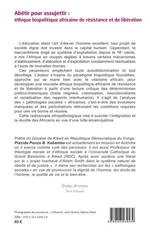 L’auteur s’inspire du paradigme biopolitique foucaldien, approche qui se marie bien avec le vitalisme africain, pour développer une nouvelle éthique biopolitique africaine de résistance et de libération à partir d’une lecture critique des déterminismes politico-historiques (traite négrière, colonisation, néocolonialisme et racialisation des rapports interhumains). Il s’agit de l’analyse des « pathologies sociales » africaines, c’est-à-dire des évolutions manquées et des perturbations détruisant les conditions requises pour une vie bonne et réussie. Cette radioscopie afropathologique vise à susciter l’indignation et la révolte des Africains en vue d’une lutte émancipatrice.